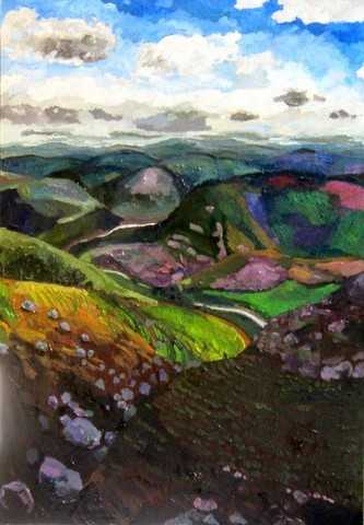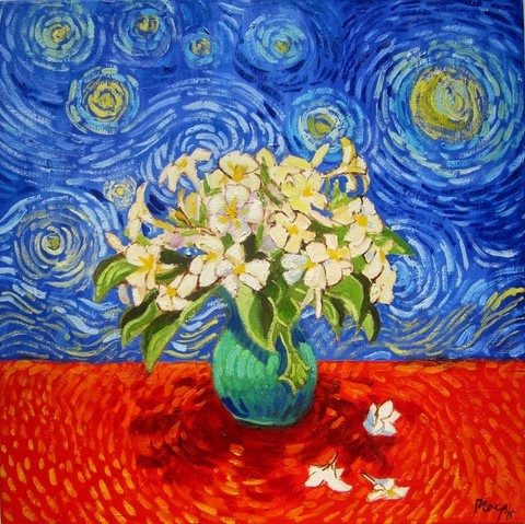 "Participo de um projeto da marchand Beth Araruna em memória dos 125 anos da morte de Van Gogh. São 15 artistas que participam desta homenagem a Van Gogh. Cada um recebeu a encomenda de pintar um conjunto de 9 telas de 50 por 50 cm, totalizando um painel de 150 por 150 cm.
